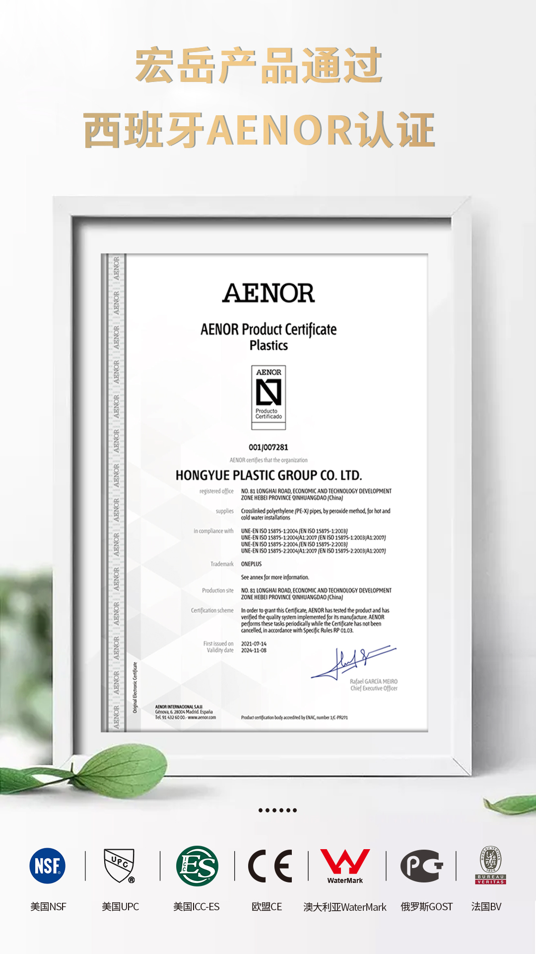 继通过美国NSF、ICC-ES、UPC,欧盟CE,澳大利亚WaterMark,俄罗斯GOST,法国BV等国际认证后,Kaiyun (中国)产品又通过西班牙AENOR认证。